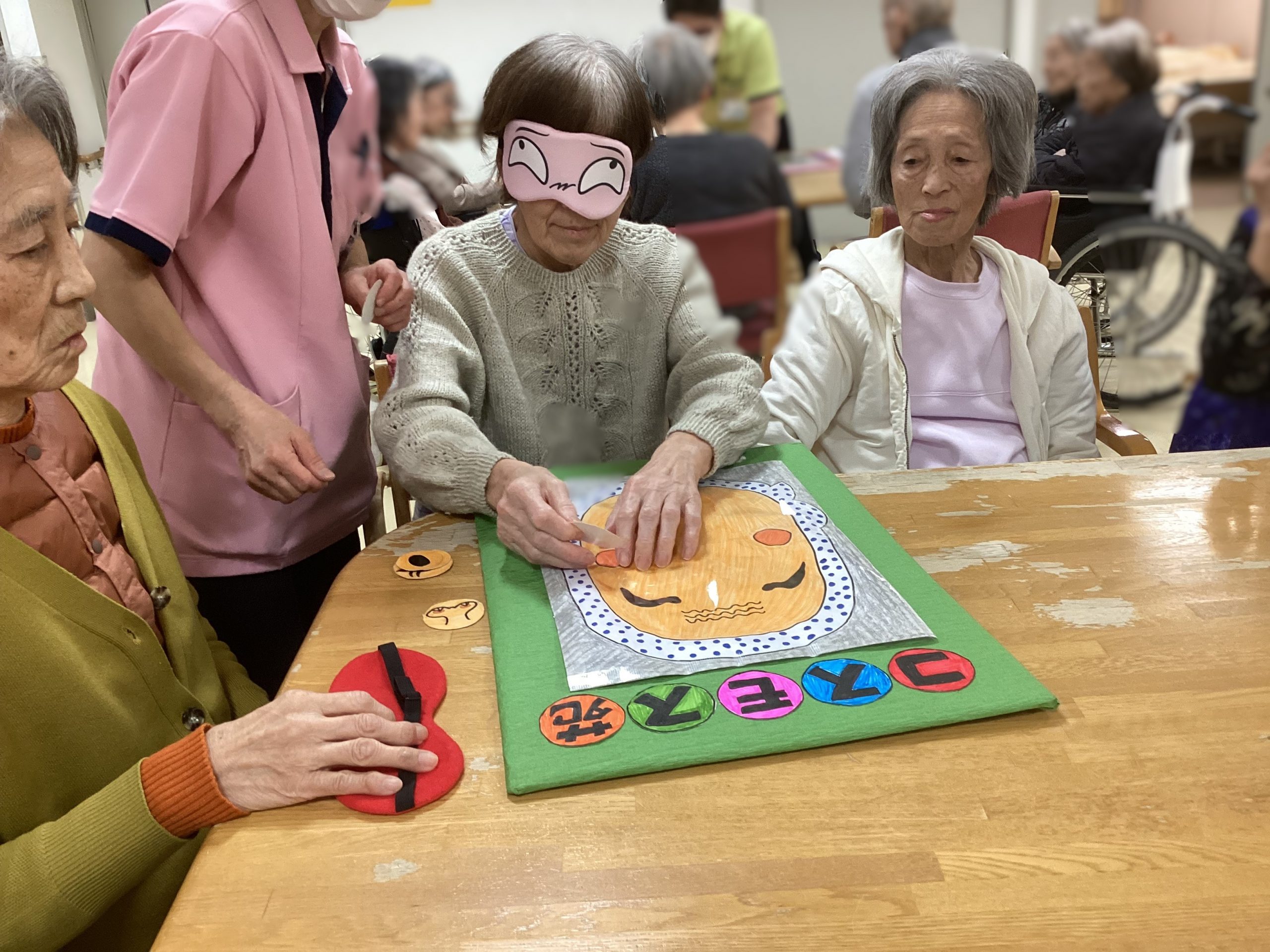続いて福笑いのご様子、目隠しをして顔のパーツを置いていきます。