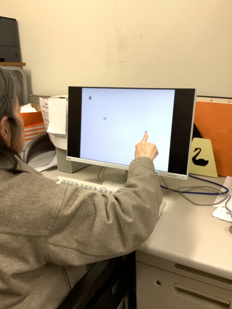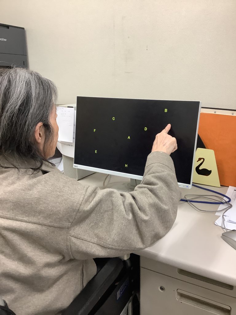 当苑では、注意障害のある利用者様に対して、パソコンを使ってリハビリテーションを実施しています。順番に出てくる仮名やアルファベットを見落とさないように選択する課題、ランダムに表示されている仮名やアルファベット中から正確に選択する課題を行い、注意力を高める練習をしています。