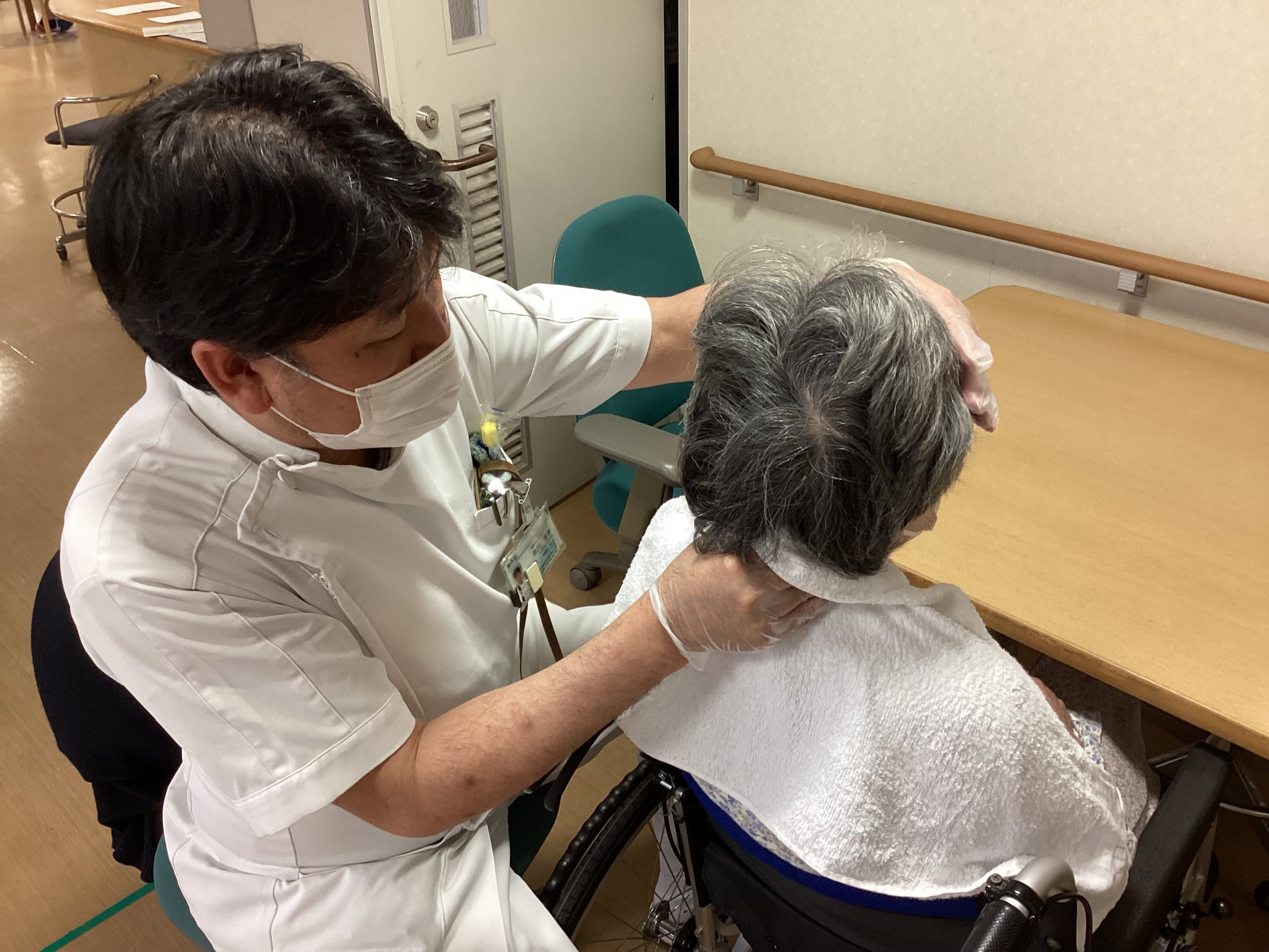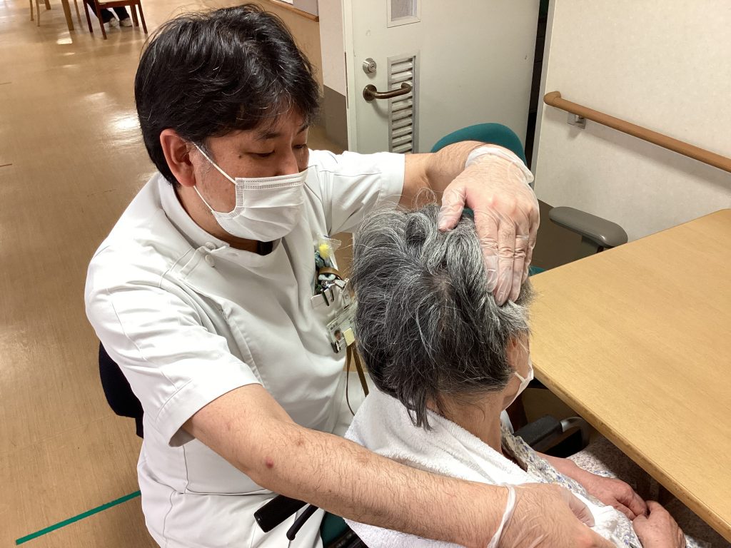 嚥下機能低下の原因として、頸部や肩の動きが影響していることがあります。そのため、嚥下機能のリハビリテーションでは、頸部や肩のストレッチやリラクゼーションを実施し、可動域拡大やスムーズな動きの獲得を目指しています。