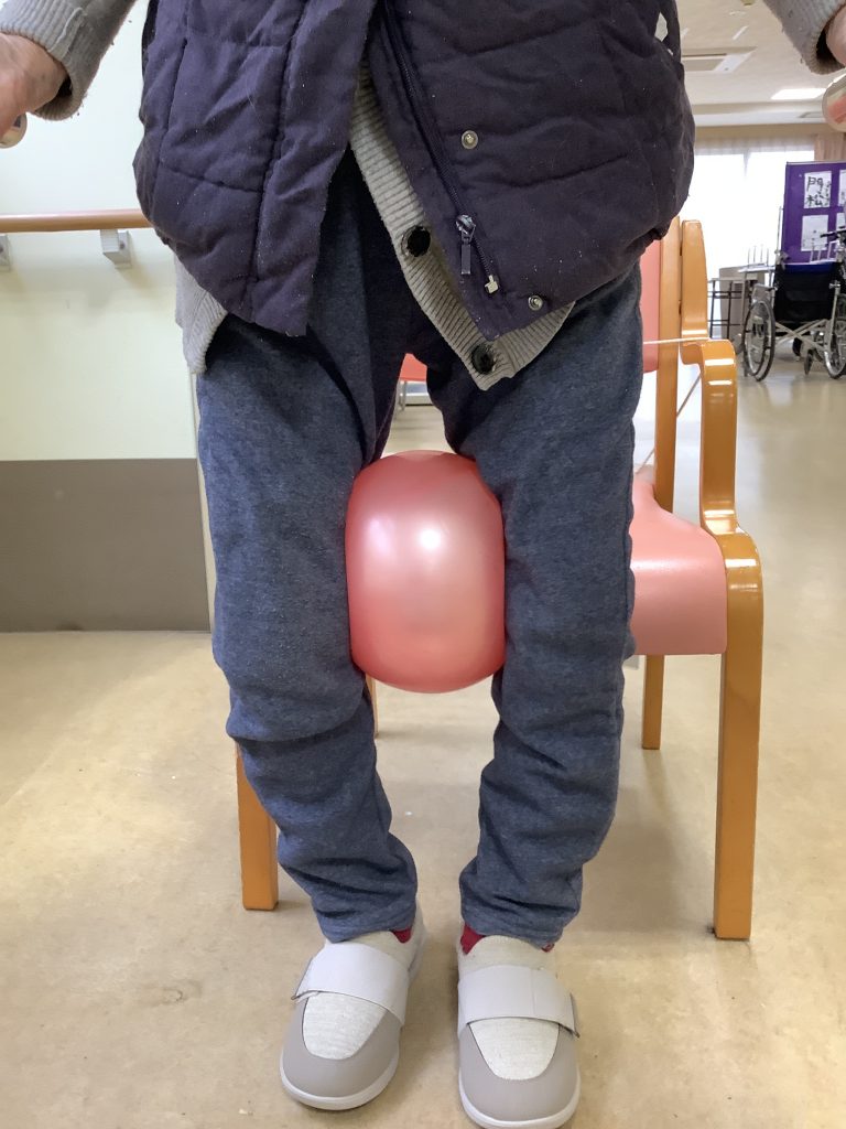コスモス苑では、リハビリテーションの一環として大腿部の内転筋の強化訓練を実施しています。