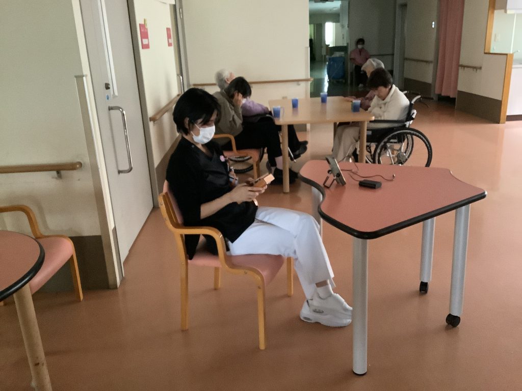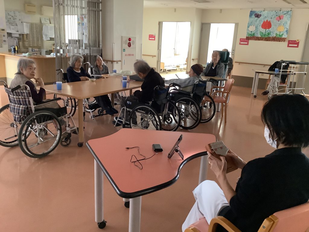 なかにはいつもより薄暗くなった環境の中、カリンバの音色が子守歌となって眠気を誘われる人もおり、夜間良眠のため演奏後には起きて頂くよう声をかけました。