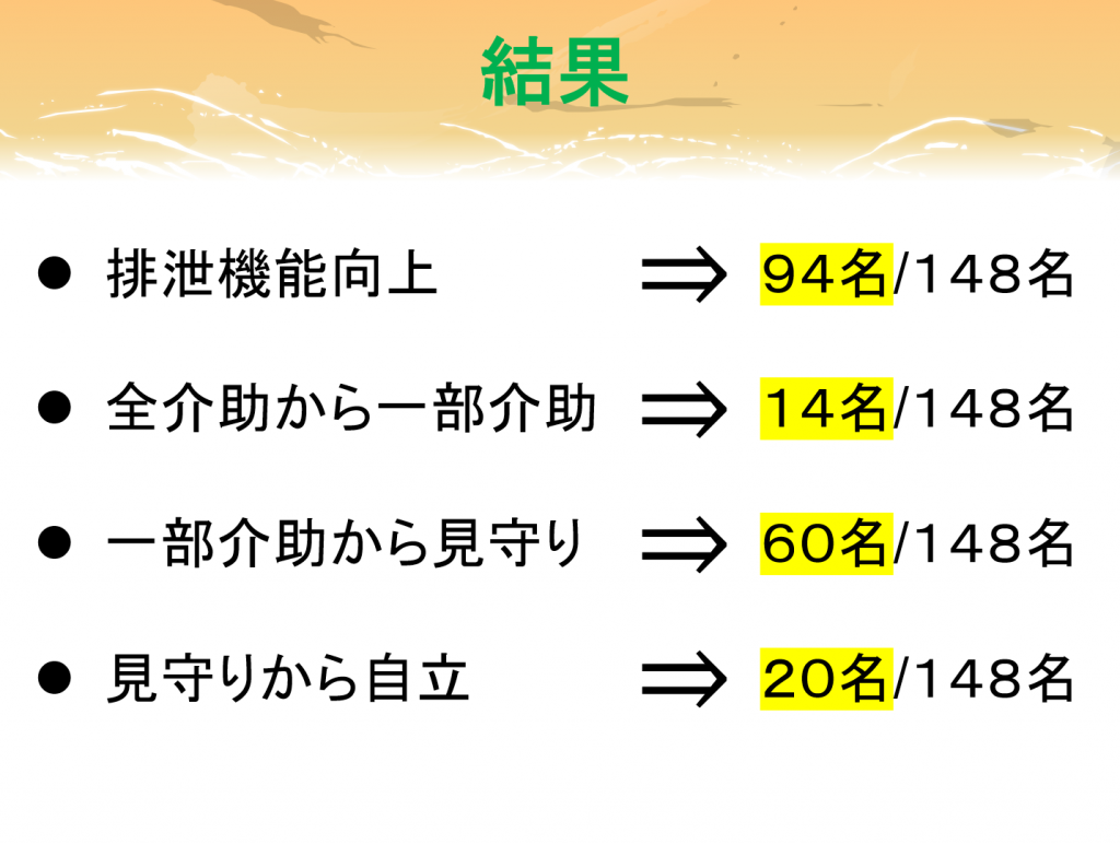 148名中94名に排泄機能の向上が見られました。入所時全介助から一部介助にて排泄が可能になった利用者は14名。一部介助から見守りになった方が60名。見守りから自立にて排泄が可能になった方が20名居られました。