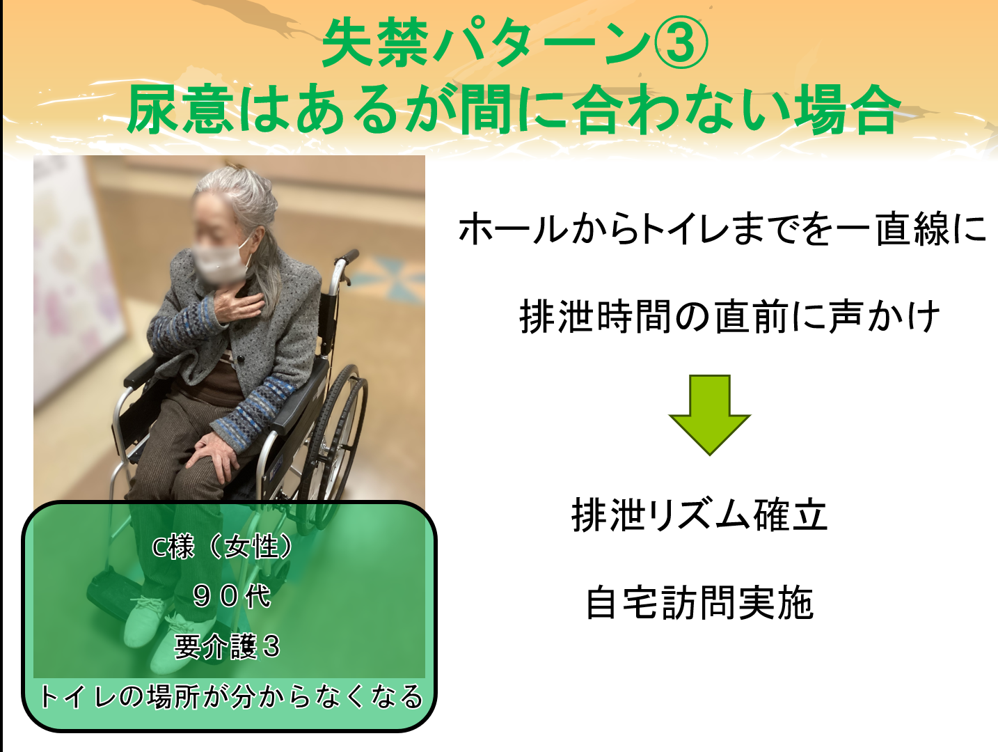 排泄パターンの分析をし失禁前にトイレへ誘導する