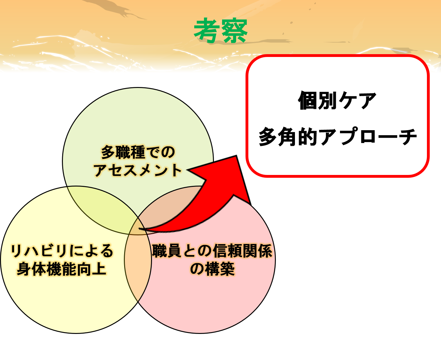 職員との信頼関係を構築し、あたたかい声掛けを行うことで意欲の維持と尊厳の回復に直結したと言えます。