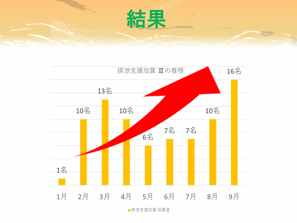 排泄支援加算Ⅲ、布パンツでの生活が可能となった方は、1月の1名から9月、16名へと増加しました。期間全体でいうと148名中39名、約4人に1人の方がオムツから布パンツへの移行に成功しました